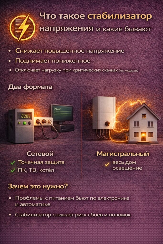 Стабилизатор напряжения — прибор, который принимает “плавающее” напряжение на входе и старается держать на выходе безопасные значения для бытовой техники (обычно вблизи 220–230 В).